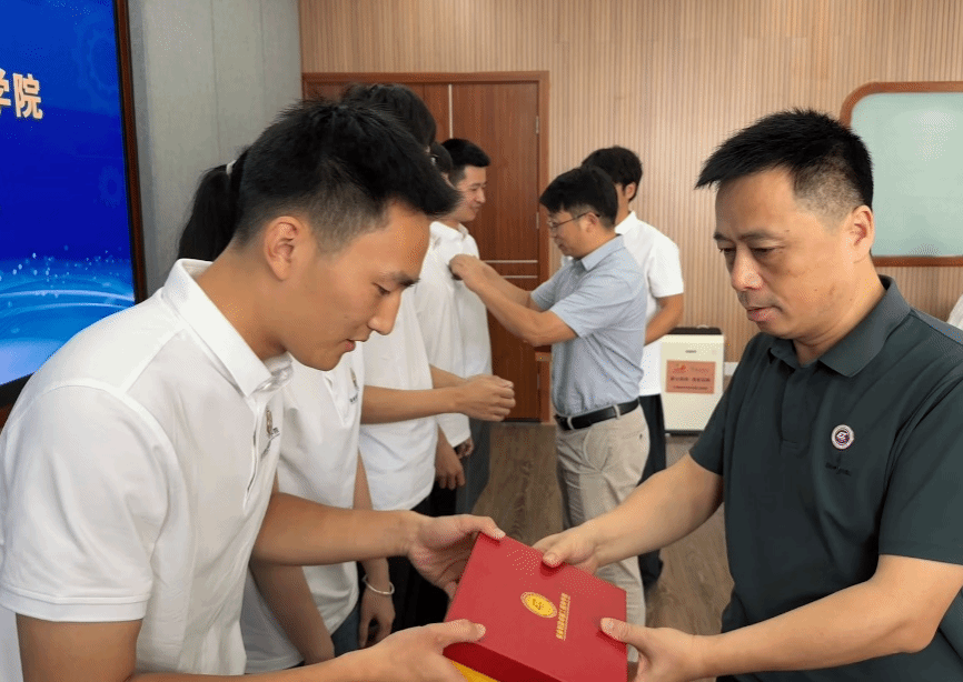 开班仪式上,肖乾为2025级新生班授旗。与会领导共同为研究生代表佩戴院徽。