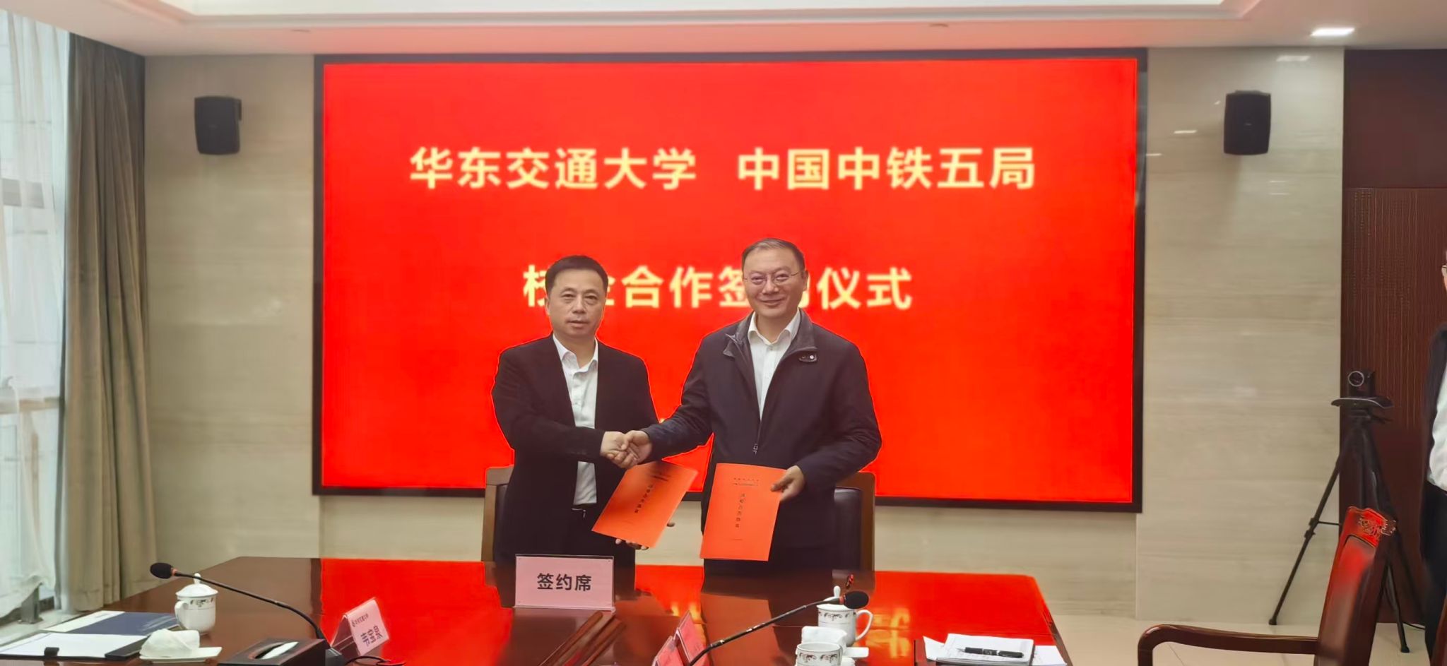 在中铁五局集团有限公司(以下简称中铁五局),肖乾一行参观了中铁五局企业文化馆,并和集团副总经理、总工程师李永毅进行了交流。肖乾指出,学校和中铁五局地缘相近人缘相亲,学校的学科专业与中铁五局的业务板块、人才需求高度契合,双方长期以来保持了良好的合作,希望双方以此次交流和战略合作协议续签为契机,在科研合作、人才培养、毕业生就业、干部员工培训等方面进一步深化合作,开创出互利共赢的新篇章。李永毅对学校长期以来对中铁五局的人才支持表示感谢,并从公司的历史沿革、员工规模、业务板块、运营范围等方面介绍了公司情况。他希望双方在人才培养、科研攻关、校企协同等方面加强合作,实现双向赋能。座谈交流后,肖乾和李永毅代表校企双方签署了校企战略合作协议。