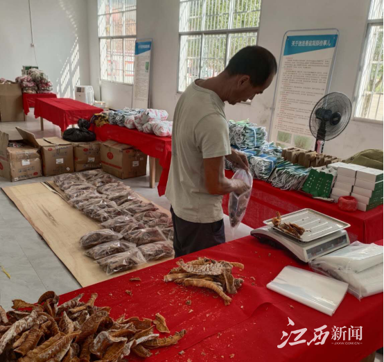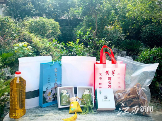 “这笋干是春笋做的,数量有限,看看它色泽黄亮,再尝尝我们做的笋干焖肉,笋干泡发后肉质肥嫩,也让焖肉带上了笋干独特的香气”“香包20元一个,是天然迷迭香做的,可以安神,包装非常精美,也是交大定制款哦”……