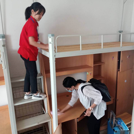 学院迎新志愿者引导新生办理报到手续,并一路护送至宿舍,帮助整理床铺书桌,充当“校内家长”。