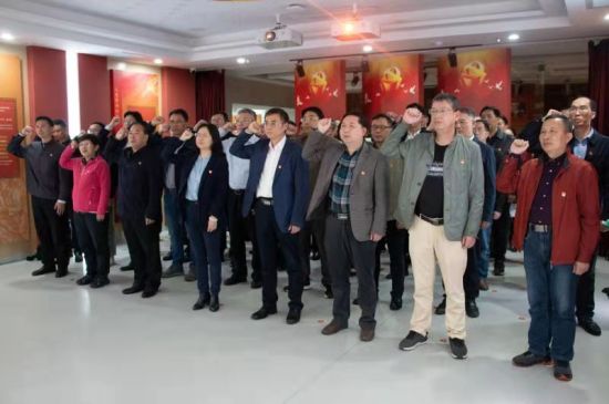 在宣誓厅宣誓墙前,面对党旗,全体党员干部庄严地举起右手,重温入党誓词。在廉政教育室,大家观看了警示教育片,并现场进行了党章知识测试。