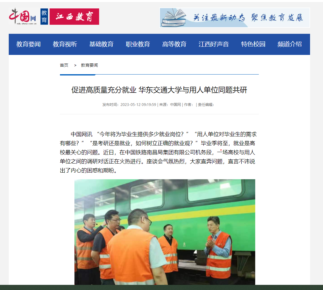 在与中国铁路南昌局集团有限公司车辆段、中国铁路呼和浩特集团有限公司等用人单位的座谈中,校企双方共同探讨了毕业生“慢就业、不就业”、用人单位“招聘需求与实际情况不匹配”等“问题清单”。调研组认真听取用人单位对学校就业工作及人才培养的建议,希望双方充分发挥各自优势,在产教融合、学生联合培养、毕业生就业创业等方面开展深度合作。调研中,校企双方达成共识,纷纷表示要坚持问题导向,为拓宽就业渠道提出新思路和新办法,切实为学生提供指导服务,提升就业育人质量。