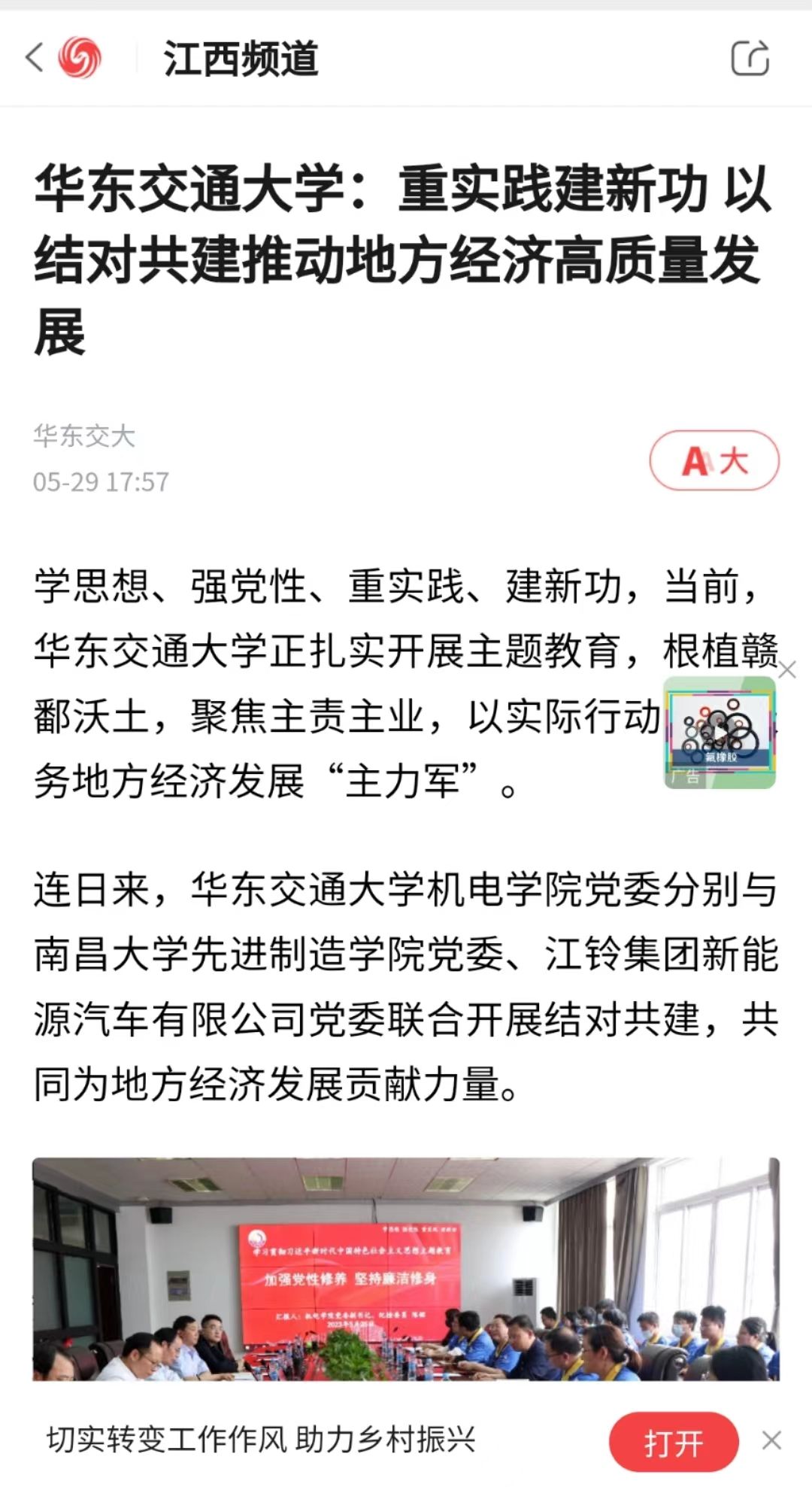 连日来,华东交通大学机电学院党委分别与南昌大学先进制造学院党委、江铃集团新能源汽车有限公司党委联合开展结对共建,共同为地方经济发展贡献力量。