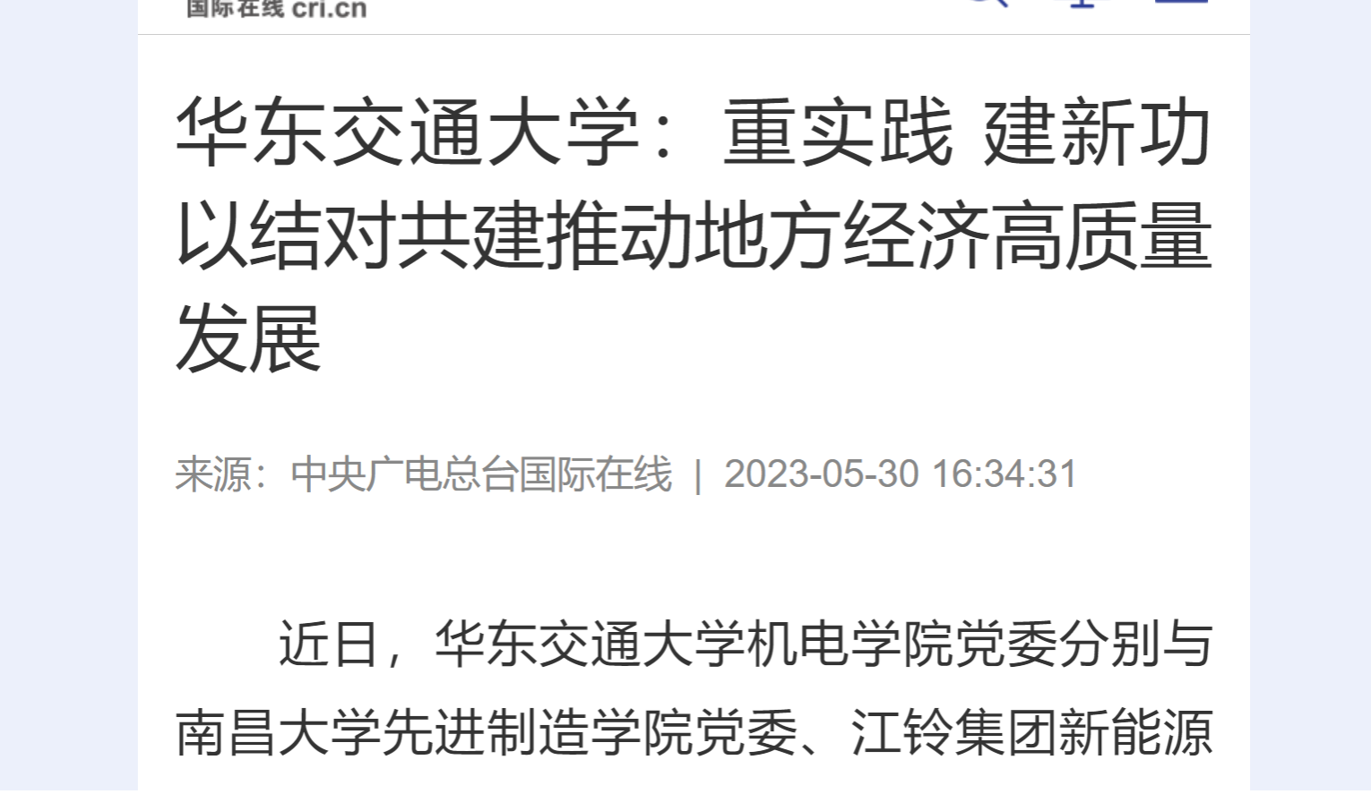 “2021年我们就与江铃集团新能源汽车有限公司开展了党建共建,双方合作紧密,推动各项工作互促互进、深度融合,取得了实实在在的成效。”华东交通大学机电学院党委书记陈和金说。连年来,校企双方在共同努力下,建设了“载运工具与装备教育部重点实验室”“智能交通装备全寿命技术创新中心”“智能交通装备产业学院”“江西省研究生联合培养基地”“江西省研究生工作站”等平台;联合申报国际合作项目、国家自然科学基金等近10项;共同指导学生参加第八届中国国际“互联网+”大学生创新创业大赛,并获得“互联网+”国家三等奖、江西省金奖……目前,双方正在建立更加灵活的研究生订单班培养机制,持续完善博士双聘制度,扩大博士后工作站的规模,加强产学研用合作,增大科研合作体量,在服务地方经济发展上展现新作为。