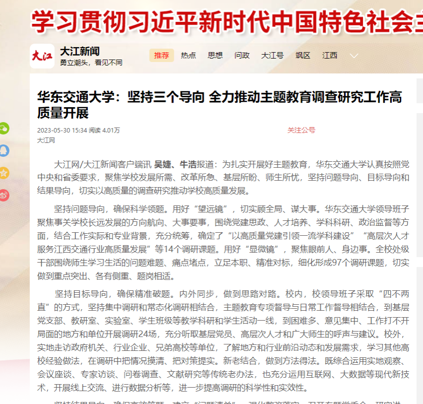 大江网/大江新闻客户端讯吴婕、牛浩报道:为扎实开展好主题教育,华东交通大学认真按照党中央和省委要求,聚焦学校发展所需、改革所急、基层所盼、师生所忧,坚持问题导向、目标导向和结果导向,切实以高质量的调查研究推动学校高质量发展。