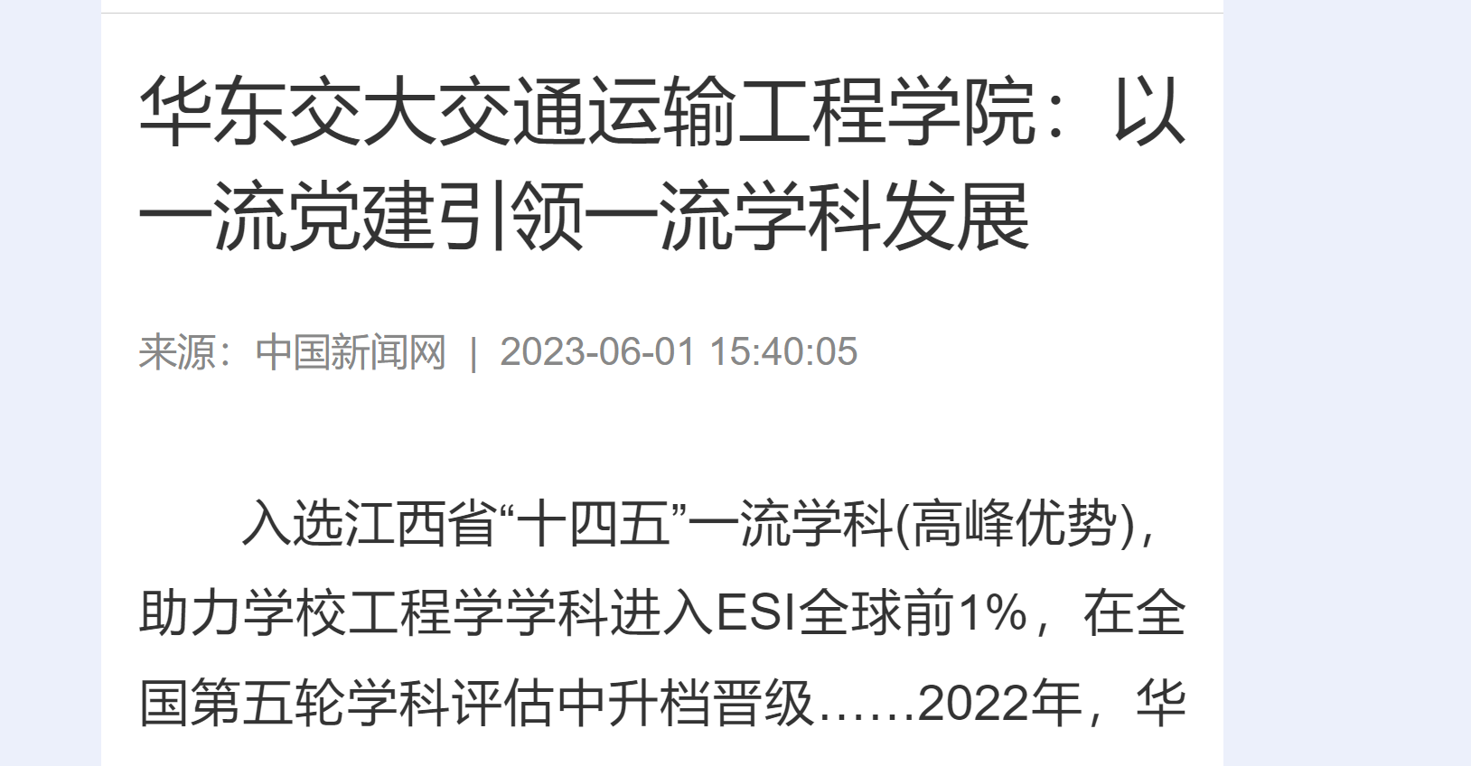 入选江西省“十四五”一流学科(高峰优势),助力学校工程学学科进入ESI全球前1%,在全国第五轮学科评估中升档晋级……2022年,华东交通大学交通运输工程学科作为该校“十四五”学科建设特区,交出了一份亮眼的成绩单。