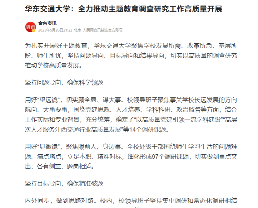 为扎实开展好主题教育,华东交通大学聚焦学校发展所需、改革所急、基层所盼、师生所忧,坚持问题导向、目标导向和结果导向,切实以高质量的调查研究推动学校高质量发展。