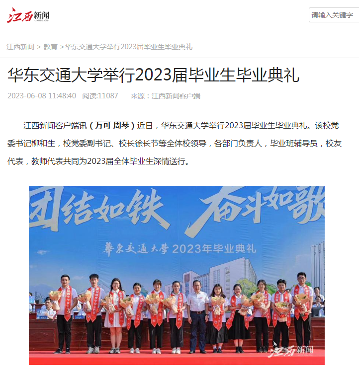 江西新闻客户端讯(万可 周琴)近日,华东交通大学举行2023届毕业生毕业典礼。该校党委书记柳和生,校党委副书记、校长徐长节等全体校领导,各部门负责人,毕业班辅导员,校友代表,教师代表共同为2023届全体毕业生深情送行。
