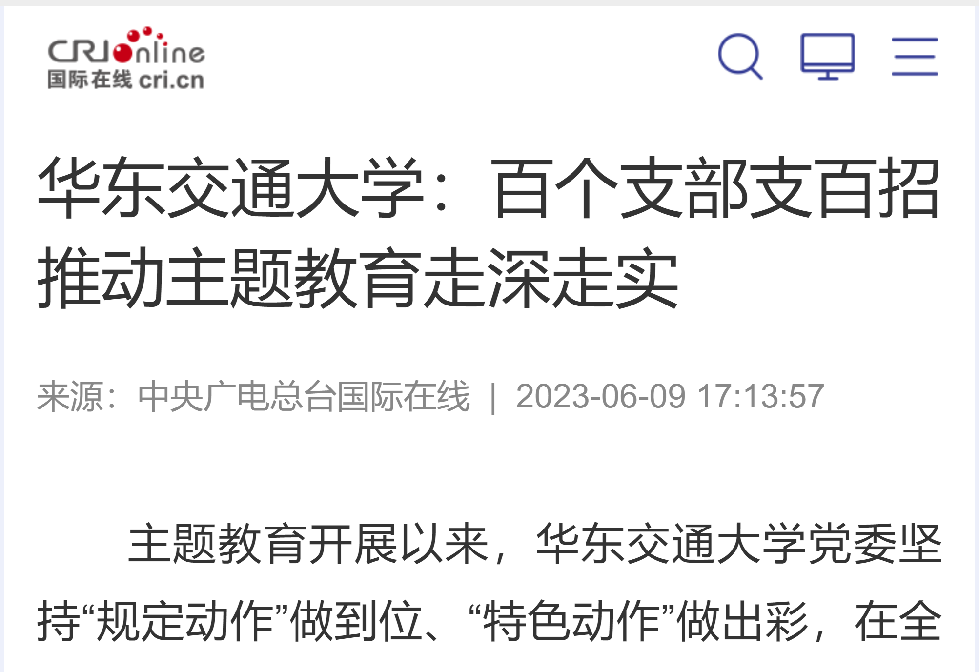 主题教育开展以来,华东交通大学党委坚持“规定动作”做到位、“特色动作”做出彩,在全校开展“百个支部支百招”活动,不断推动主题教育走深走实、见行见效。