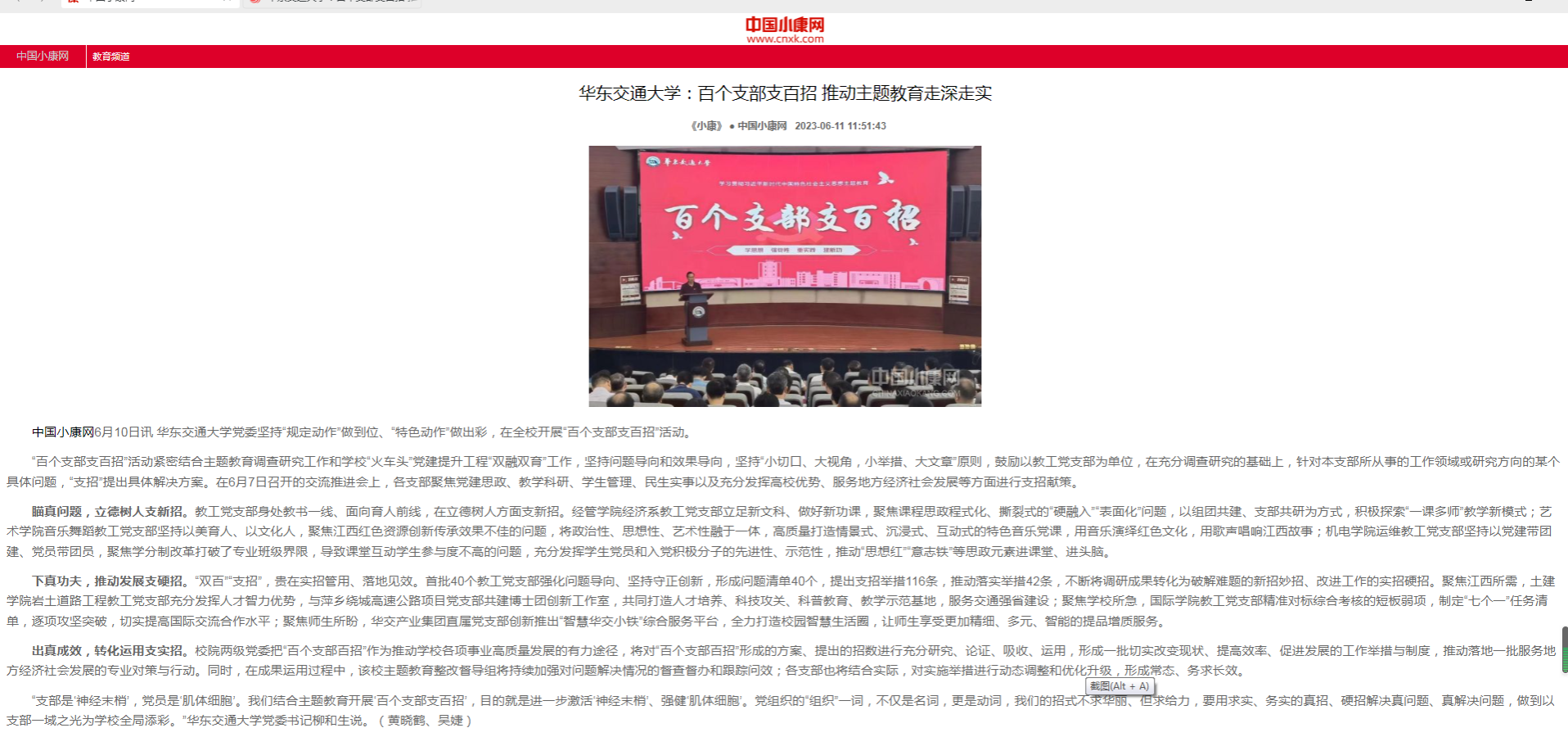 “支部是‘神经末梢’,党员是‘肌体细胞’。我们结合主题教育开展‘百个支部支百招’,目的就是进一步激活‘神经末梢’、强健‘肌体细胞’。党组织的“组织”一词,不仅是名词,更是动词,我们的招式不求华丽、但求给力,要用求实、务实的真招、硬招解决真问题、真解决问题,做到以支部一域之光为学校全局添彩。”华东交通大学党委书记柳和生说。