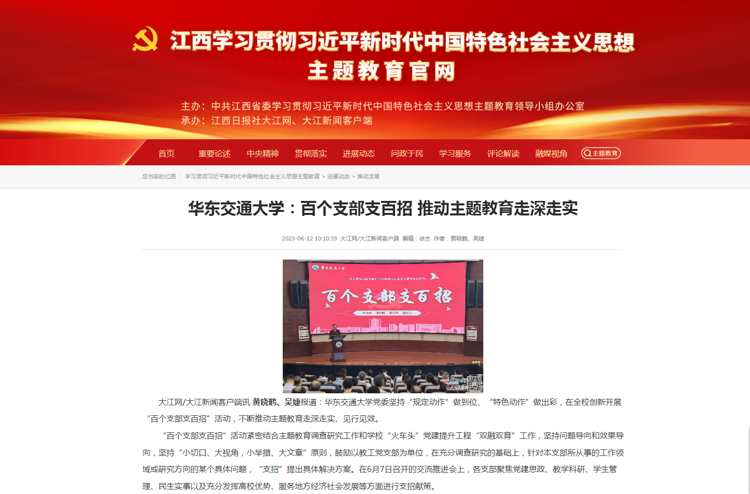 大江网/大江新闻客户端讯黄晓鹤、吴婕报道:华东交通大学党委坚持“规定动作”做到位、“特色动作”做出彩,在全校创新开展“百个支部支百招”活动,不断推动主题教育走深走实、见行见效。