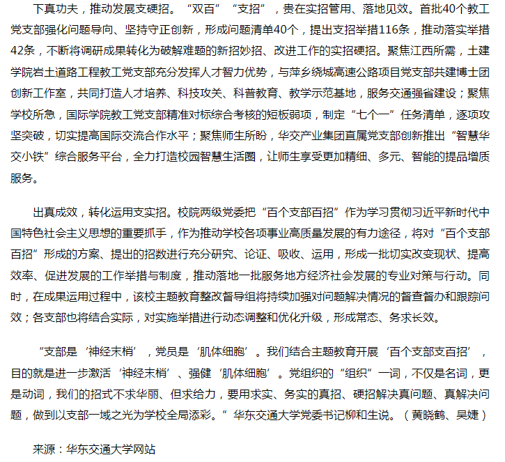 华东交通大学党委坚持“规定动作”做到位、“特色动作”做出彩,在全校开展“百个支部支百招”活动,不断推动学习贯彻习近平新时代中国特色社会主义思想主题教育走深走实、见行见效。