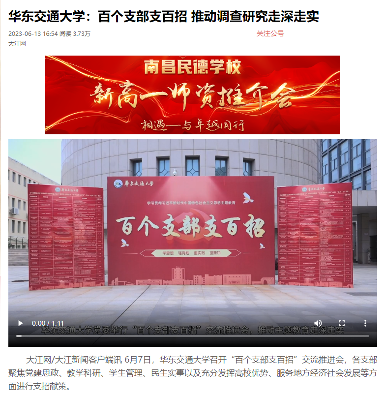 大江网/大江新闻客户端讯 6月7日,华东交通大学召开“百个支部支百招”交流推进会,各支部聚焦党建思政、教学科研、学生管理、民生实事以及充分发挥高校优势、服务地方经济社会发展等方面进行支招献策。