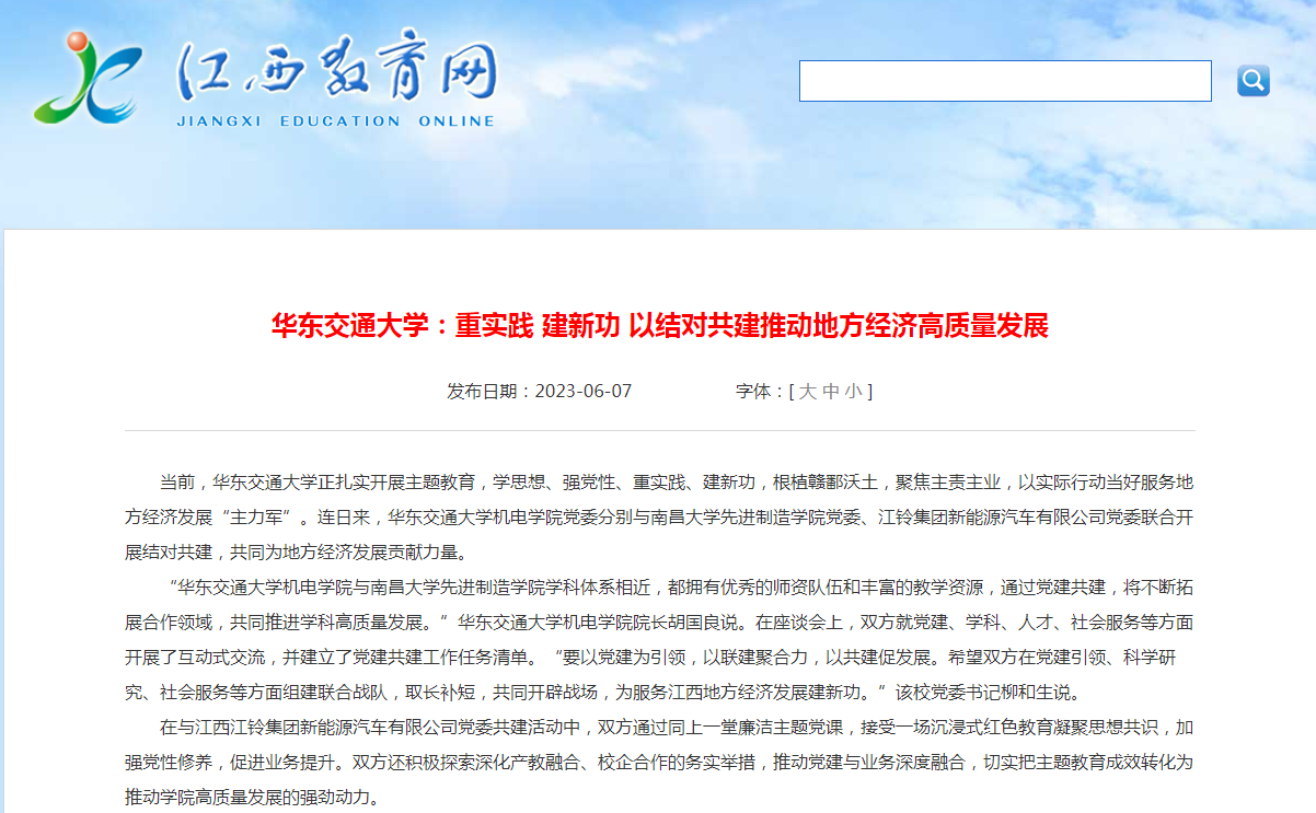 “2021年我们就与江铃新能源开展了党建共建,双方合作紧密,推动各项工作互促互进、深度融合,取得了实实在在的成效。”华东交通大学机电学院党委书记陈和金说。近年来,校企双方在共同努力下,建设了载运工具与装备教育部重点实验室、智能交通装备全寿命技术创新中心、智能交通装备产业学院、江西省研究生联合培养基地、江西省研究生工作站等平台;联合申报国际合作项目、国家自然科学基金等近10项;共同指导学生参加第八届中国国际“互联网+”大学生创新创业大赛,并获得“互联网+”国家三等奖、江西省金奖……目前,双方正在建立更加灵活的研究生订单班培养机制,持续完善博士双聘制度,扩大博士后工作站的规模,加强产学研用合作,增大科研合作体量,在服务地方经济发展上展现新作为。