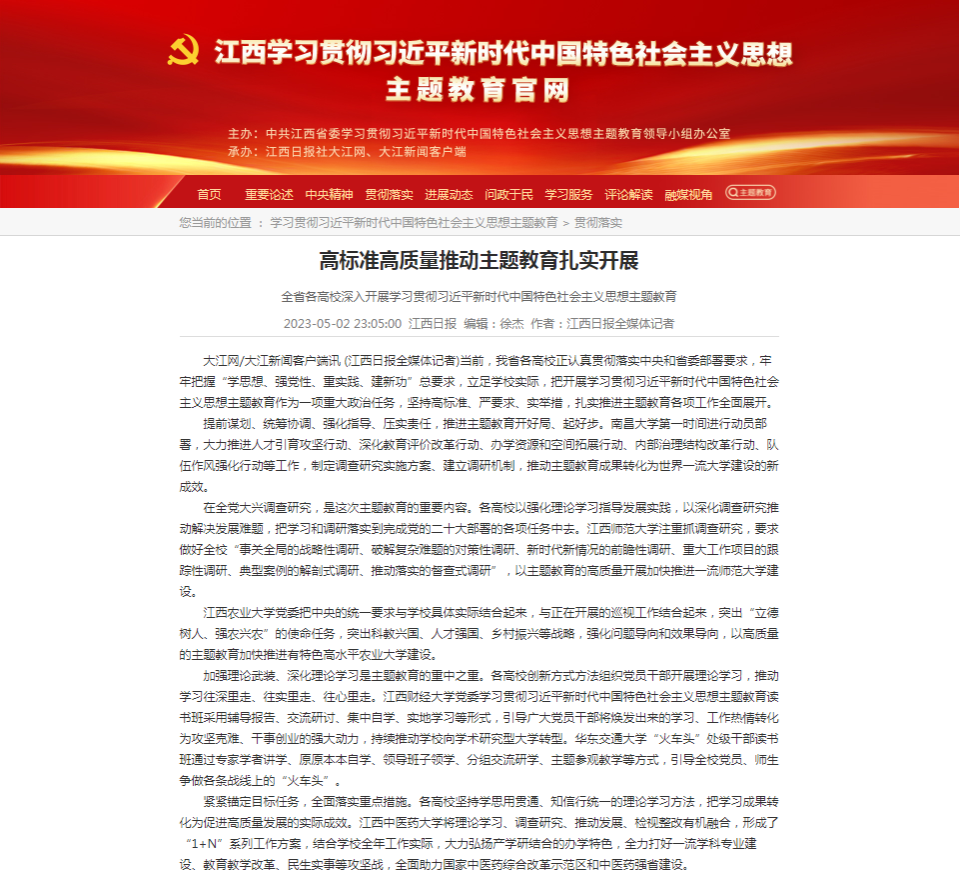 豫章师范学院把主题教育与学习党的二十大精神结合起来,举办校管干部学习贯彻党的二十大精神专题研讨班,将主题教育与推动学校中心工作结合起来,努力以主题教育成效推进学校高质量发展,开创学校工作新局面。南昌医学院将主题教育目标要求与推动学校转型升级、高质量发展相融合,紧扣学校建设发展的工作瓶颈和问题短板,聚焦师生高度关注的重点难点问题进行调查研究,把学习成果转化为促进高质量内涵式发展的实际成效。