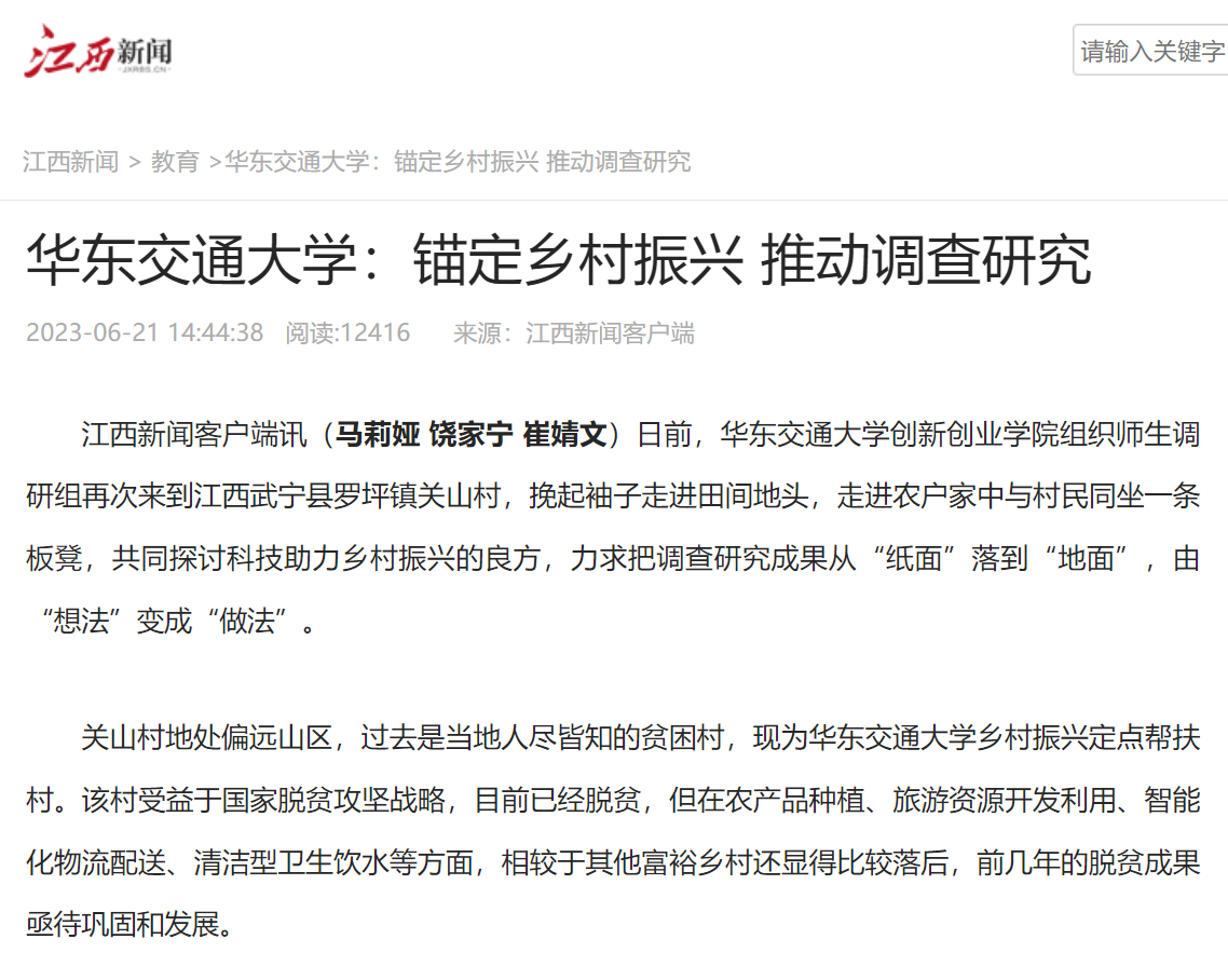 半年来,华东交通大学创新创业学院调研团队利用自身优势对关山村高质量发展支招献策,让村民切切实实感受到科技助力乡村振兴的实效,也让学生对服务国家乡村振兴战略有了更强的使命担当。