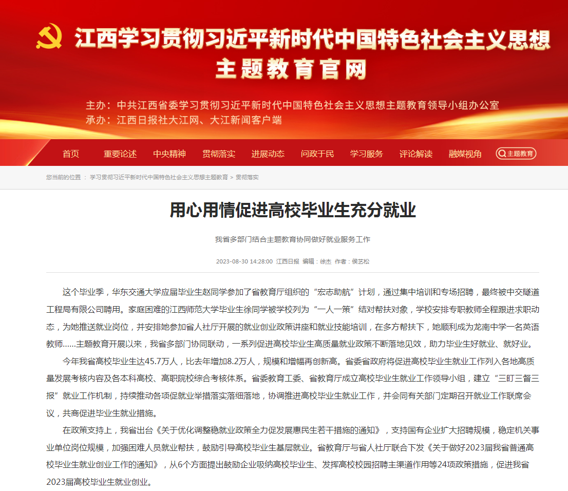 这个毕业季,华东交通大学应届毕业生赵同学参加了省教育厅组织的“宏志助航”计划,通过集中培训和专场招聘,最终被中交隧道工程局有限公司聘用。家庭困难的江西师范大学毕业生徐同学被学校列为“一人一策”结对帮扶对象,学校安排专职教师全程跟进求职动态,为她推送就业岗位,并安排她参加省人社厅开展的就业创业政策讲座和就业技能培训,在多方帮扶下,她顺利成为龙南中学一名英语教师……主题教育开展以来,我省多部门协同联动,一系列促进高校毕业生高质量就业政策不断落地见效,助力毕业生好就业、就好业。