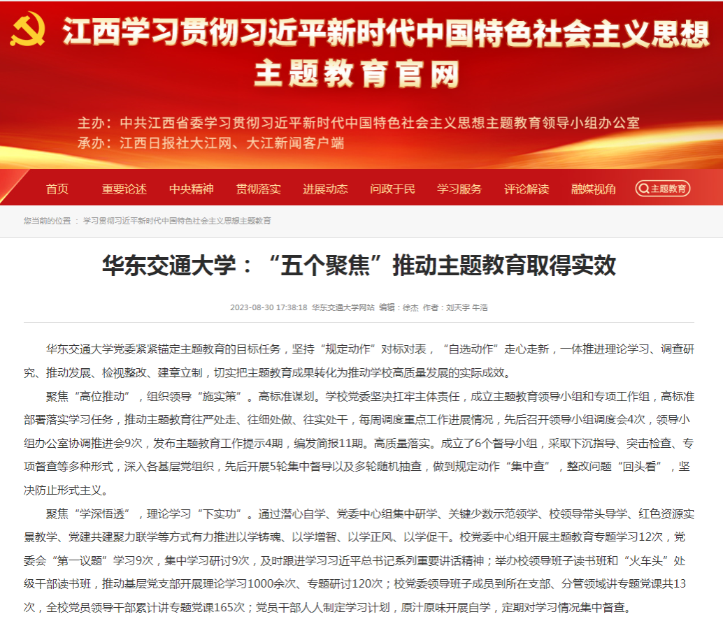 华东交通大学党委紧紧锚定主题教育的目标任务,坚持“规定动作”对标对表,“自选动作”走心走新,一体推进理论学习、调查研究、推动发展、检视整改、建章立制,切实把主题教育成果转化为推动学校高质量发展的实际成效。