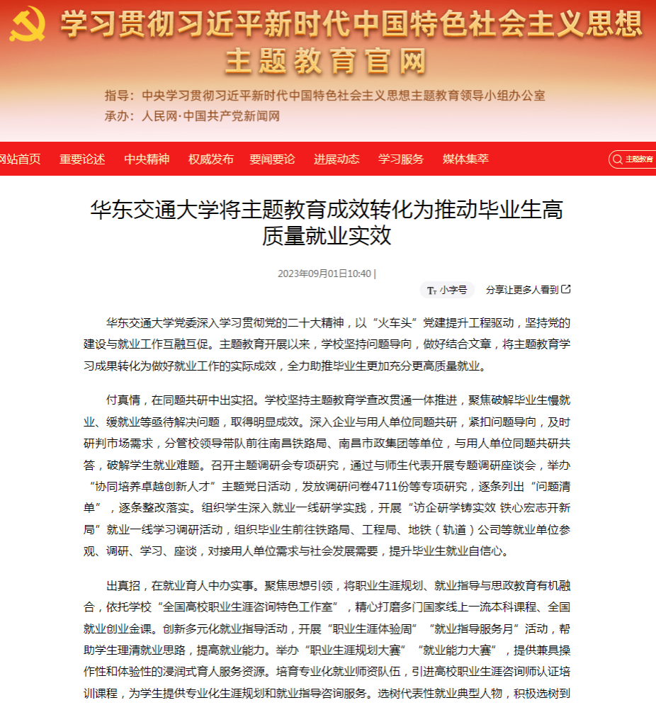 就业是最大的民生。主题教育开展以来,学校进一步完善了提高效率、促进发展的就业工作举措,推动了一批服务学生就业能力提升的对策与行动。下一步,华东交大将继续推进主题教育与就业工作同频共振、一体推进,全力推动毕业生高质量充分就业。