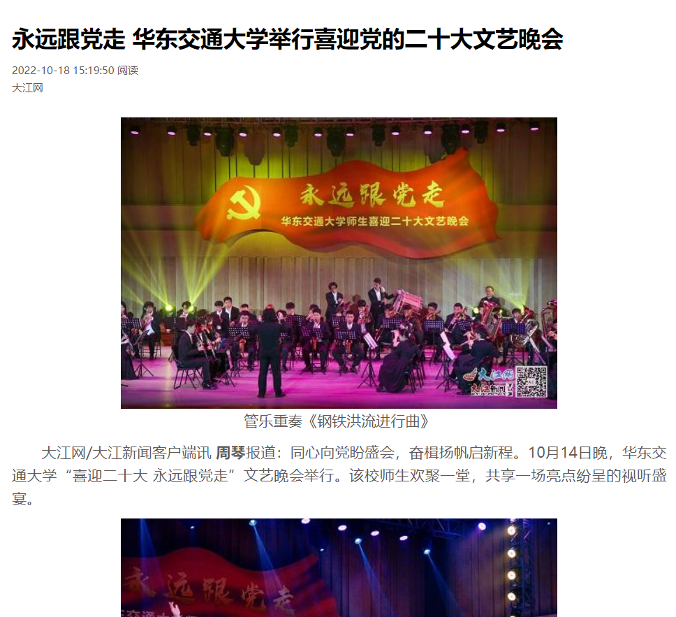同心向党盼盛会,奋楫扬帆启新程。10月14日晚,华东交通大学“喜迎党的二十大 永远跟党走”文艺晚会举行。该校师生欢聚一堂,共享一场亮点纷呈的视听盛宴。