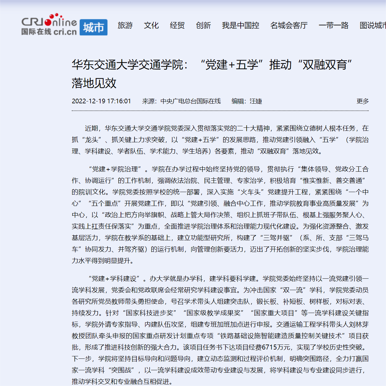 近期,华东交通大学交通学院党委深入贯彻落实党的二十大精神,紧紧围绕立德树人根本任务,在抓“龙头”、抓关键上力求突破,以“党建+五学”的发展思路,推动党建引领融入“五学”(学院治理、学科建设、学者队伍、学术能力、学生培养)各要素,推动“双融双育”落地见效。