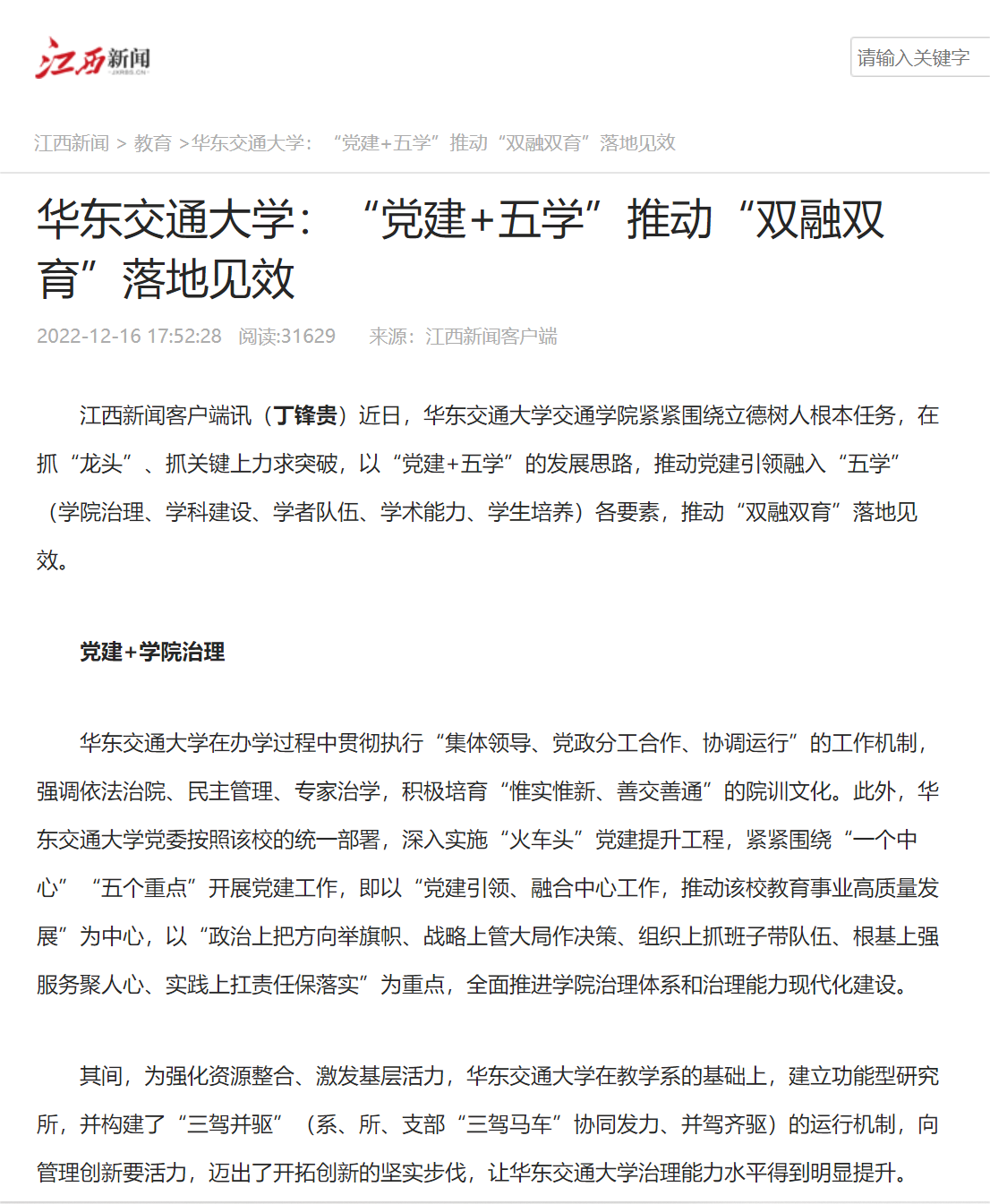 其间,为强化资源整合、激发基层活力,华东交通大学在教学系的基础上,建立功能型研究所,并构建了“三驾并驱”(系、所、支部“三驾马车”协同发力、并驾齐驱)的运行机制,向管理创新要活力,迈出了开拓创新的坚实步伐,让华东交通大学治理能力水平得到明显提升。