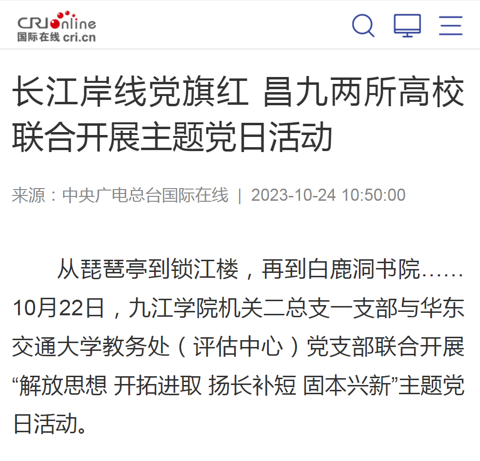 从琵琶亭到锁江楼,再到白鹿洞书院……10月22日,九江学院机关二总支一支部与华东交通大学教务处(评估中心)党支部联合开展“解放思想 开拓进取 扬长补短 固本兴新”主题党日活动。