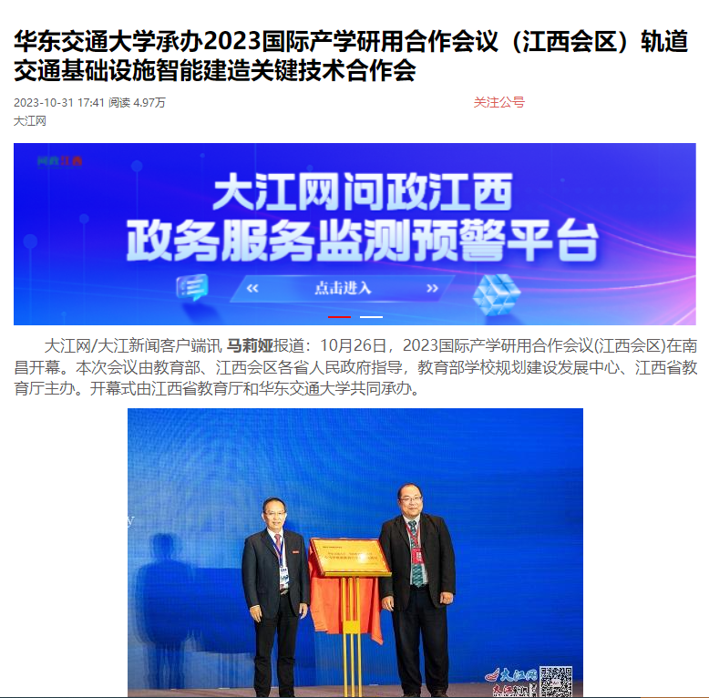【大江网】华东交通大学承办2023国际产学研用合作会议(江西会区)轨道交通基础设施智能建造关键技术合作会