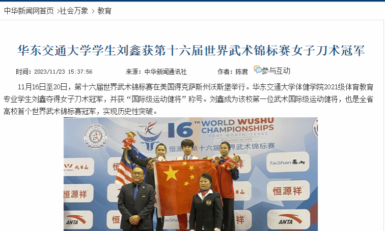 11月16日至20日,第十六届世界武术锦标赛在美国得克萨斯州沃斯堡举行。华东交通大学体健学院2021级体育教育专业学生刘鑫夺得女子刀术冠军,并获“国际级运动健将”称号。刘鑫成为该校第一位武术国际级运动健将,也是全省高校首个世界武术锦标赛冠军,实现历史性突破。