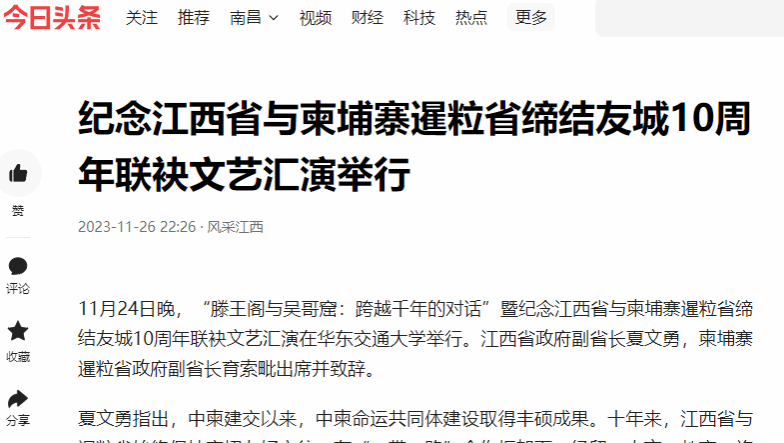 【今日头条】纪念江西省与柬埔寨暹粒省缔结友城10周年联袂文艺汇演举行