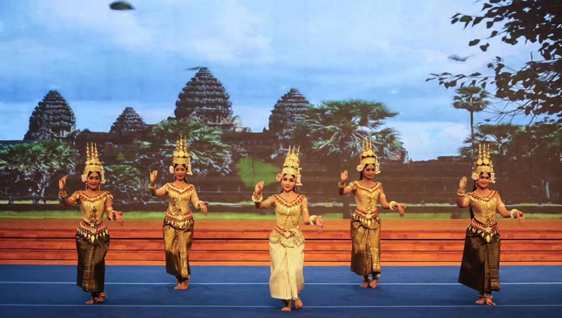 柬埔寨舞蹈《飞天》,舞者们身着柬埔寨传统服饰,用美丽而优雅的舞姿展现民族特色;被列入联合国教科文组织《人类非物质文化遗产代表作名录》的舞蹈《哈努曼戏美人鱼》,通过灵活多变的肢体语言,以舞传意,让观众了解到其孔剧的精髓;《拜林孔雀舞》,在柬埔寨民族乐的伴奏下,舞者以优美的身姿,使得两只“绿孔雀”栩栩如生、活灵活现。
