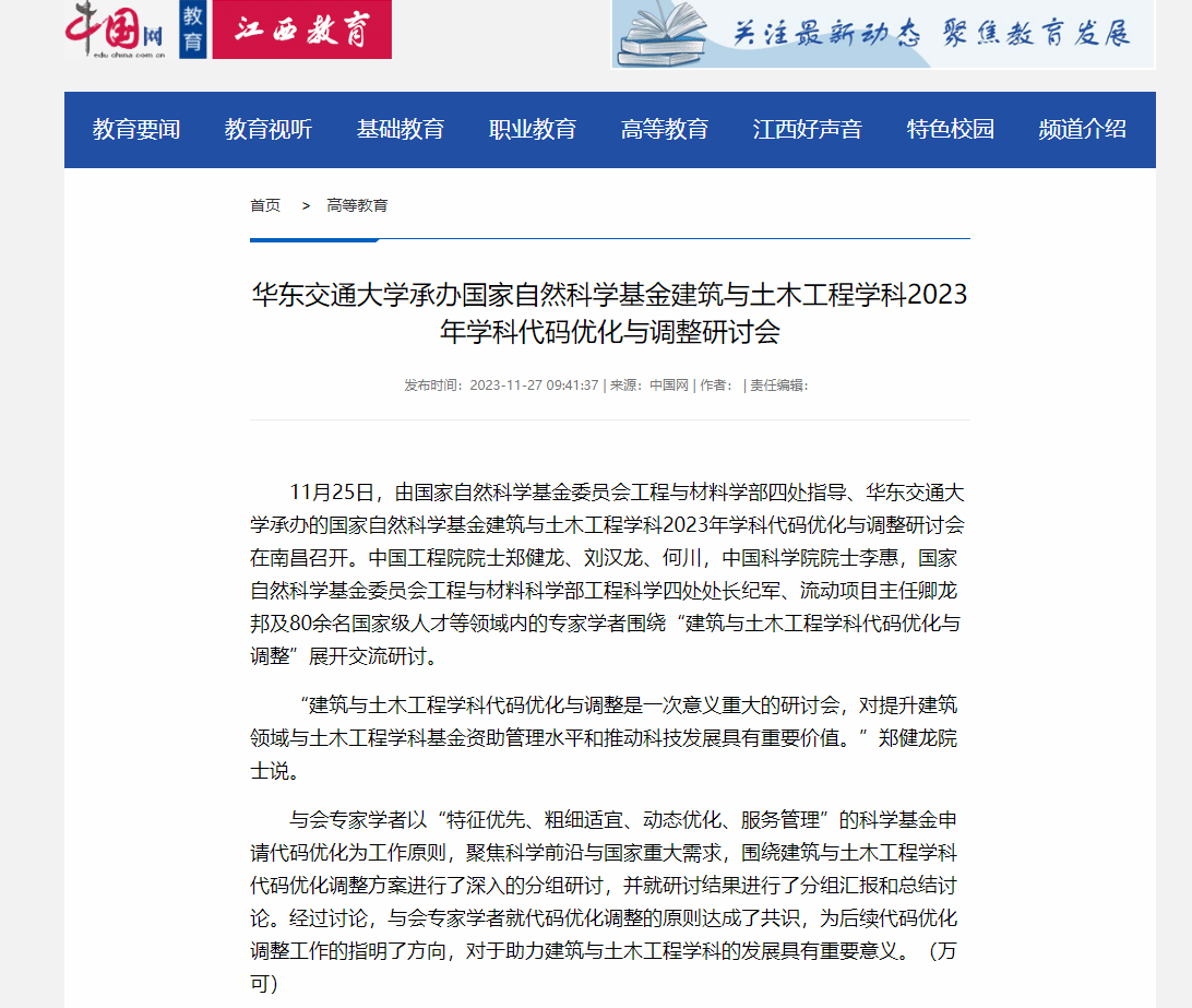 11月25日,由国家自然科学基金委员会工程与材料学部四处指导、华东交通大学承办的国家自然科学基金建筑与土木工程学科2023年学科代码优化与调整研讨会在南昌召开。中国工程院院士郑健龙、刘汉龙、何川,中国科学院院士李惠,国家自然科学基金委员会工程与材料科学部工程科学四处处长纪军、流动项目主任卿龙邦及80余名国家级人才等领域内的专家学者围绕“建筑与土木工程学科代码优化与调整”展开交流研讨。