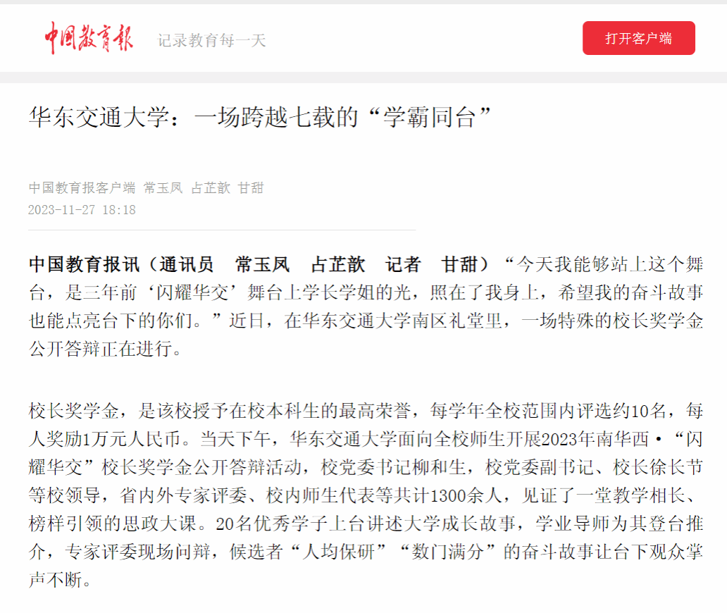 校长奖学金,是该校授予在校本科生的最高荣誉,每学年全校范围内评选约10名,每人奖励1万元人民币。当天下午,华东交通大学面向全校师生开展2023年南华西·“闪耀华交”校长奖学金公开答辩活动,校党委书记柳和生,校党委副书记、校长徐长节等校领导,省内外专家评委、校内师生代表等共计1300余人,见证了一堂教学相长、榜样引领的思政大课。20名优秀学子上台讲述大学成长故事,学业导师为其登台推介,专家评委现场问辩,候选者“人均保研”“数门满分”的奋斗故事让台下观众掌声不断。