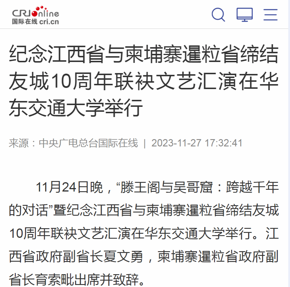 11月24日晚,“滕王阁与吴哥窟:跨越千年的对话”暨纪念江西省与柬埔寨暹粒省缔结友城10周年联袂文艺汇演在华东交通大学举行。江西省政府副省长夏文勇,柬埔寨暹粒省政府副省长育索毗出席并致辞。