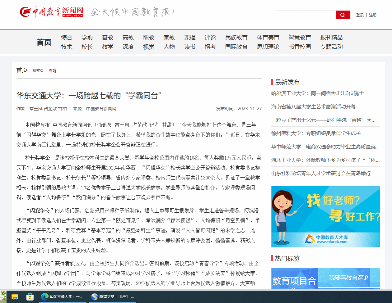 自2017年起,该校启动“闪耀华交”校长奖学金公开答辩,创新尝试学生自我总结、师生推介评选的做法,深入开展思政教育有形化探索,并不断丰富完善内容、形式和载体。现已连续举办七届,激励全校学子带着一脉相承的使命担当,共赴建设科技强国的新征程。