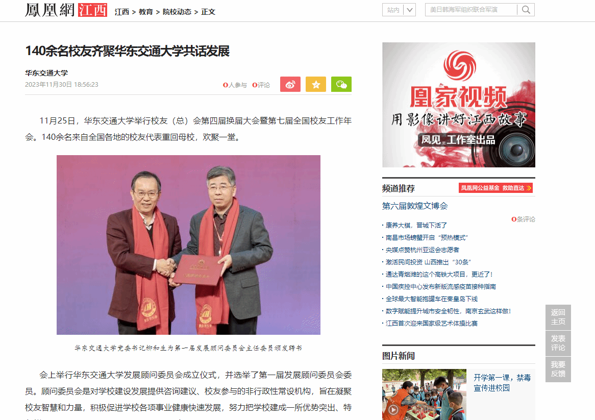 “华交毕业生在各行各业都彰显下得去、吃得苦、留得住、干得好、上得来、出得彩的铁人铁军特质,母校的发展饱含着校友们对母校的无限期盼和无比支持。”华东交通大学党委书记柳和生表示,学校发展顾问委员会将和校友会一同构建起母校和校友的荣誉共同体、发展共同体和命运共同体,真正使母校和校友因共融而共荣,校友与校友因为同窗而同创,打造成为有号召力、有凝聚力、有影响力、有创造力的服务校友的平台。