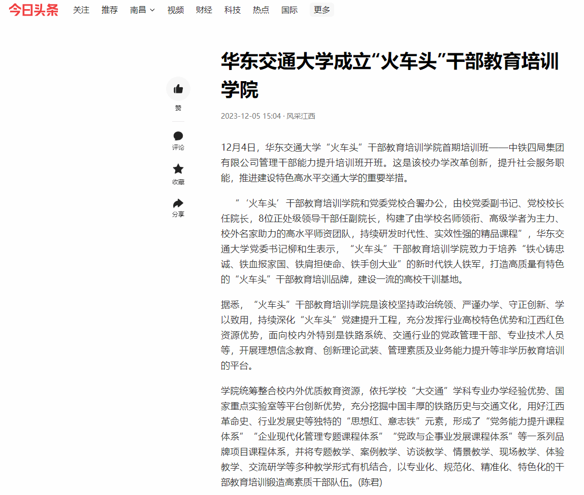 据悉,“火车头”干部教育培训学院是该校坚持政治统领、严谨办学、守正创新、学以致用,持续深化“火车头”党建提升工程,充分发挥行业高校特色优势和江西红色资源优势,面向校内外特别是铁路系统、交通行业的党政管理干部、专业技术人员等,开展理想信念教育、创新理论武装、管理素质及业务能力提升等非学历教育培训的平台。