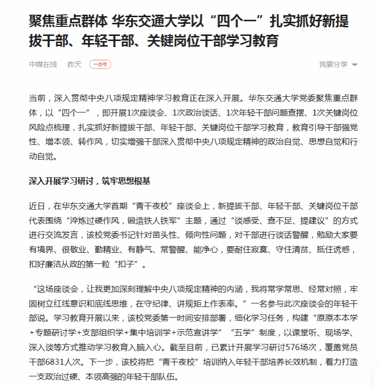 当前,深入贯彻中央八项规定精神学习教育正在深入开展。华东交通大学党委聚焦重点群体,以“四个一”,即开展1次座谈会、1次政治谈话、1次年轻干部问题查摆、1次关键岗位风险点梳理,扎实抓好新提拔干部、年轻干部、关键岗位干部学习教育,教育引导干部强党性、增本领、转作风,切实增强干部深入贯彻中央八项规定精神的政治自觉、思想自觉和行动自觉。