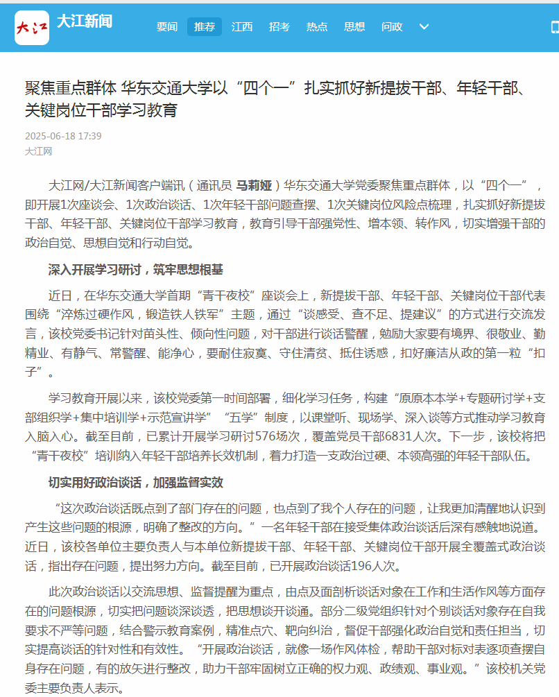 华东交通大学党委聚焦重点群体,以“四个一”,即开展1次座谈会、1次政治谈话、1次年轻干部问题查摆、1次关键岗位风险点梳理,扎实抓好新提拔干部、年轻干部、关键岗位干部学习教育,教育引导干部强党性、增本领、转作风,切实增强干部的政治自觉、思想自觉和行动自觉。