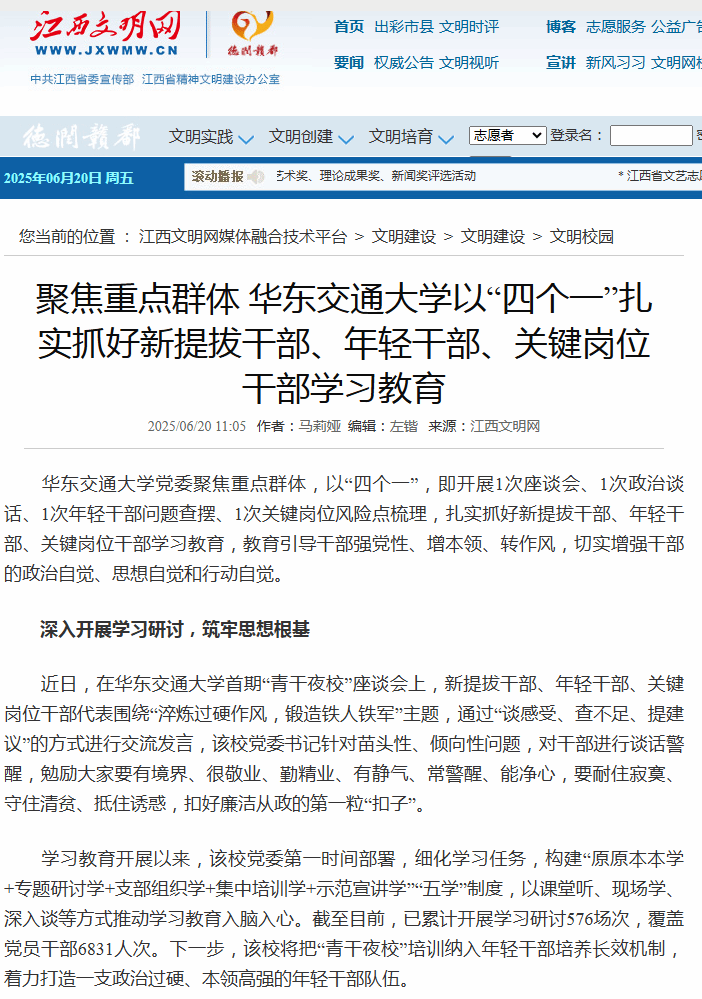 华东交通大学党委聚焦重点群体,以“四个一”,即开展1次座谈会、1次政治谈话、1次年轻干部问题查摆、1次关键岗位风险点梳理,扎实抓好新提拔干部、年轻干部、关键岗位干部学习教育,教育引导干部强党性、增本领、转作风,切实增强干部的政治自觉、思想自觉和行动自觉。