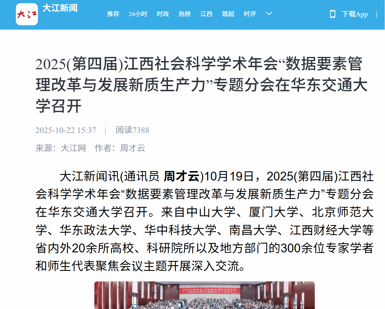 10月19日,2025(第四届)江西社会科学学术年会“数据要素管理改革与发展新质生产力”专题分会在华东交通大学召开。来自中山大学、厦门大学、北京师范大学、华东政法大学、华中科技大学、南昌大学、江西财经大学等省内外20余所高校、科研院所以及地方部门的300余位专家学者和师生代表聚焦会议主题开展深入交流。