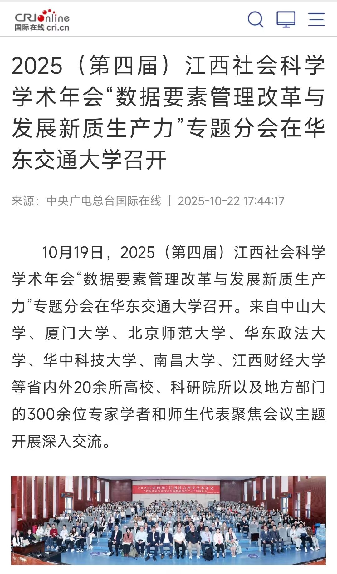 10月19日,2025(第四届)江西社会科学学术年会“数据要素管理改革与发展新质生产力”专题分会在华东交通大学召开。来自中山大学、厦门大学、北京师范大学、华东政法大学、华中科技大学、南昌大学、江西财经大学等省内外20余所高校、科研院所以及地方部门的300余位专家学者和师生代表聚焦会议主题开展深入交流。