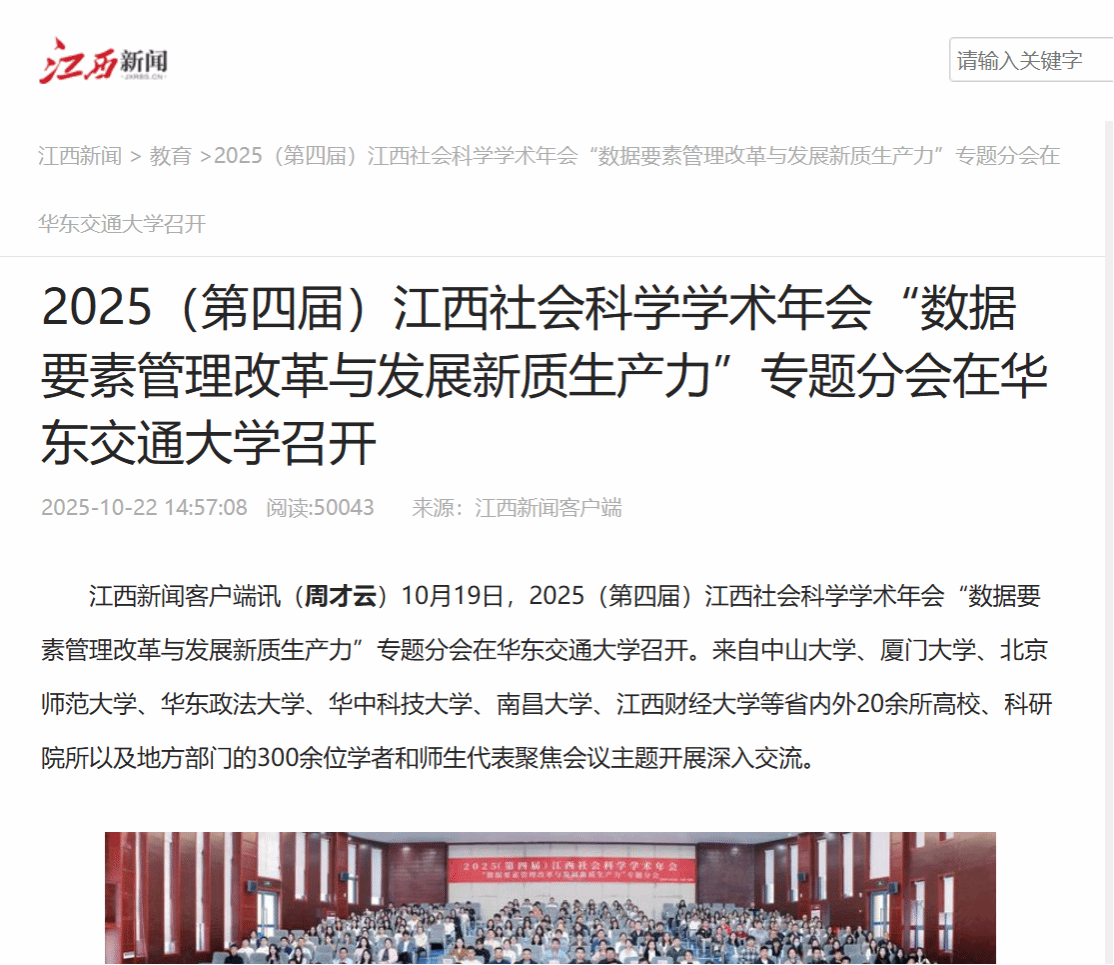 10月19日,2025(第四届)江西社会科学学术年会“数据要素管理改革与发展新质生产力”专题分会在华东交通大学召开。来自中山大学、厦门大学、北京师范大学、华东政法大学、华中科技大学、南昌大学、江西财经大学等省内外20余所高校、科研院所以及地方部门的300余位学者和师生代表聚焦会议主题开展深入交流。