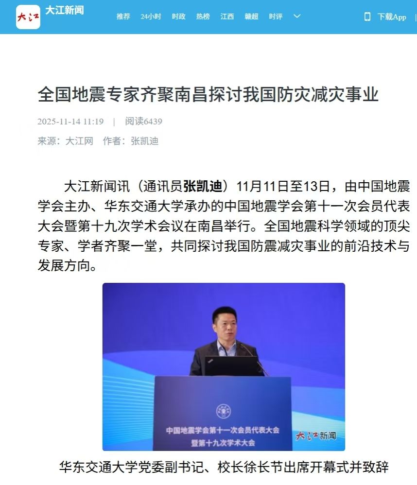 “防震减灾是关系国计民生、社会安全与可持续发展的重要事业。面对这一重大自然灾害挑战,深入推进地震科学研究、提升工程抗震能力,是地震科学工作者义不容辞的责任和使命。”华东交通大学党委副书记、校长徐长节表示,本次大会作为中国地震学会的重要学术盛会,为全国地震科学工作者搭建了高水平的学术交流与合作平台,为推动学科交叉与协同创新提供了宝贵契机。