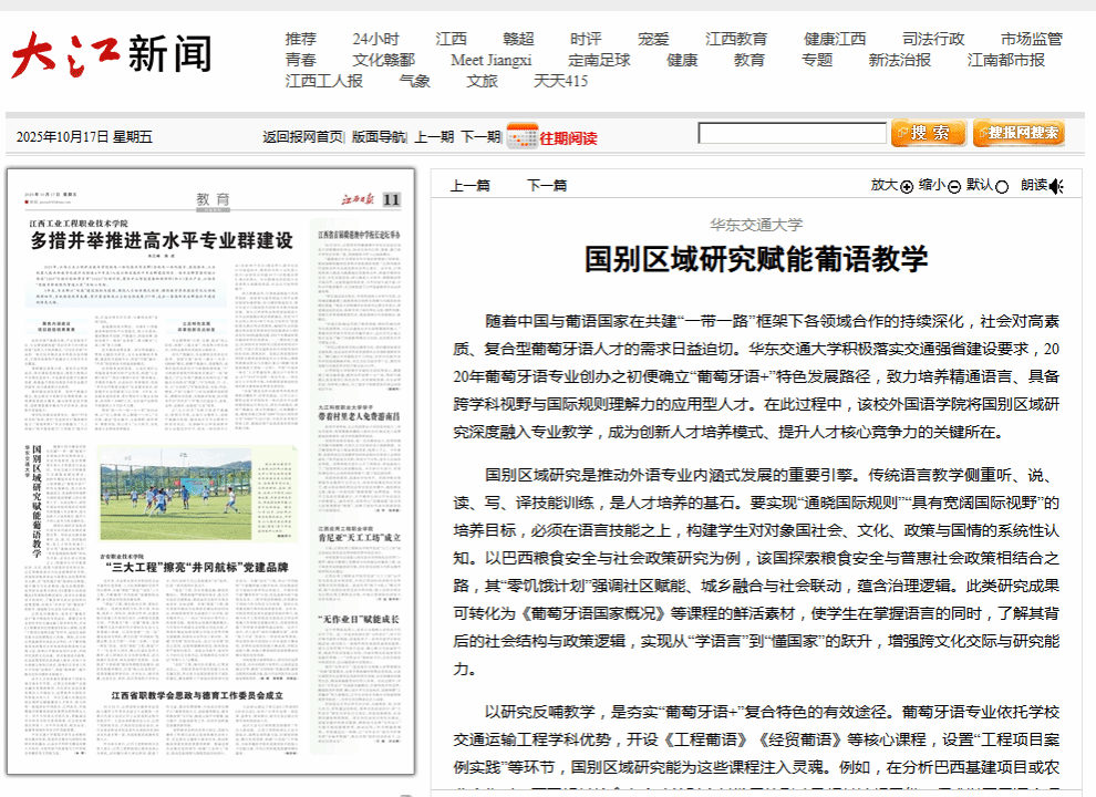 涉外人才培养最终要服务于国家与地方高水平开放。江西正在构建产业就业融合发展新格局,为经济社会高质量发展注入不竭动力,亟需能参与国际合作的复合型人才。华东交通大学通过国别区域研究赋能葡语人才培养,致力培育一批能讲好中国故事、江西故事,并能精准对接葡语国家发展需求的桥梁式人才。学生不仅语言功底扎实,更能通过学术研究分析对象国国情,在全球发展倡议背景下,为中外在减贫、粮食安全、基建等领域的务实合作贡献智慧。