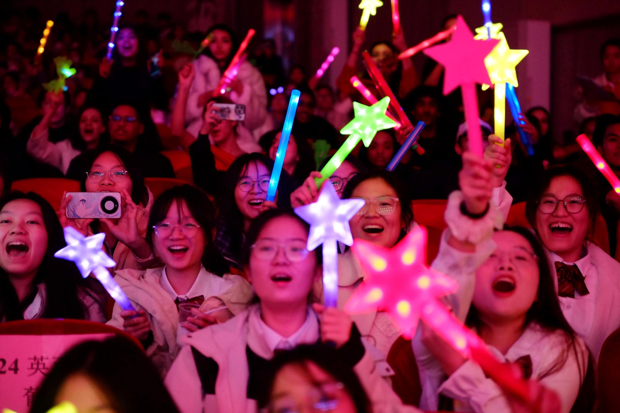本次外文大合唱分为“胜利”“和平”“复兴”三个篇章,九支参赛队伍依次登台展示。在翻译硕士2024级1班、翻译硕士2025级1班带来的《Who says》中,听见年轻一代对自我的坚定认同;由英语(国际贸易)2024级1班、2班共同呈现的《We Are the World》,用歌声架起沟通的桥梁,传递出天下一家、共筑和平的深切向往;而一曲《如愿》,则将寻常人的梦想轻轻托起,与时代共鸣。由教师共同演唱的《我相信》,以激昂的旋律点燃全场,将晚会推向高潮,铿锵的旋律中承载着师者深切的信任与期待,他们相信每一位学子终将奔赴山海、光芒万丈。舞台上下,掌声与歌声交融,闪耀的荧光如星河流转,共同照亮这个属于青春、和平与希望的夜晚。