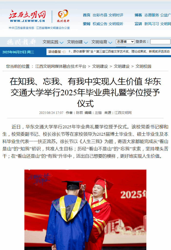 近日,华东交通大学举行2025年毕业典礼暨学位授予仪式。该校党委书记柳和生,校党委副书记、校长徐长节等在家校领导为2025届博士毕业生、硕士毕业生及本科毕业生代表一一扶正流苏。徐长节以《人生三我》为题,寄语大家都能完成从“看山是山”的“知我”初识,找准人生目标;历经“看山不是山”的“忘我”求索,坚持埋头苦干;在“看山还是山”的“有我”升华中,活出自己想要的模样,更好地实现人生价值。
