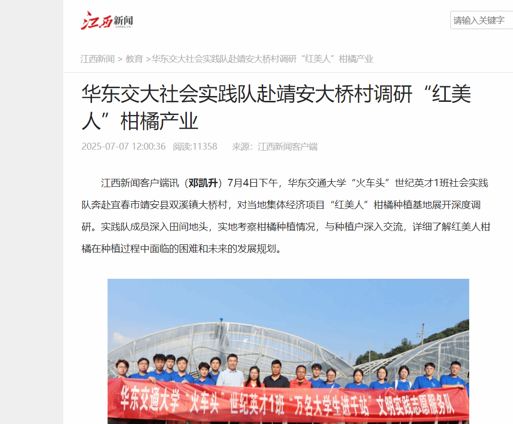 7月4日下午,华东交通大学“火车头”世纪英才1班社会实践队奔赴宜春市靖安县双溪镇大桥村,对当地集体经济项目“红美人”柑橘种植基地展开深度调研。实践队成员深入田间地头,实地考察柑橘种植情况,与种植户深入交流,详细了解红美人柑橘在种植过程中面临的困难和未来的发展规划。