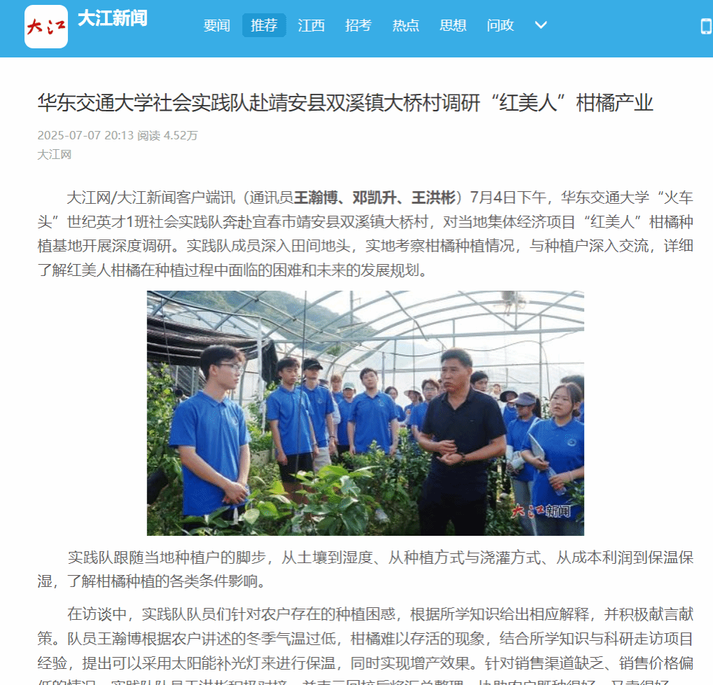 7月4日下午,华东交通大学“火车头”世纪英才1班社会实践队奔赴宜春市靖安县双溪镇大桥村,对当地集体经济项目“红美人”柑橘种植基地开展深度调研。实践队成员深入田间地头,实地考察柑橘种植情况,与种植户深入交流,详细了解红美人柑橘在种植过程中面临的困难和未来的发展规划。