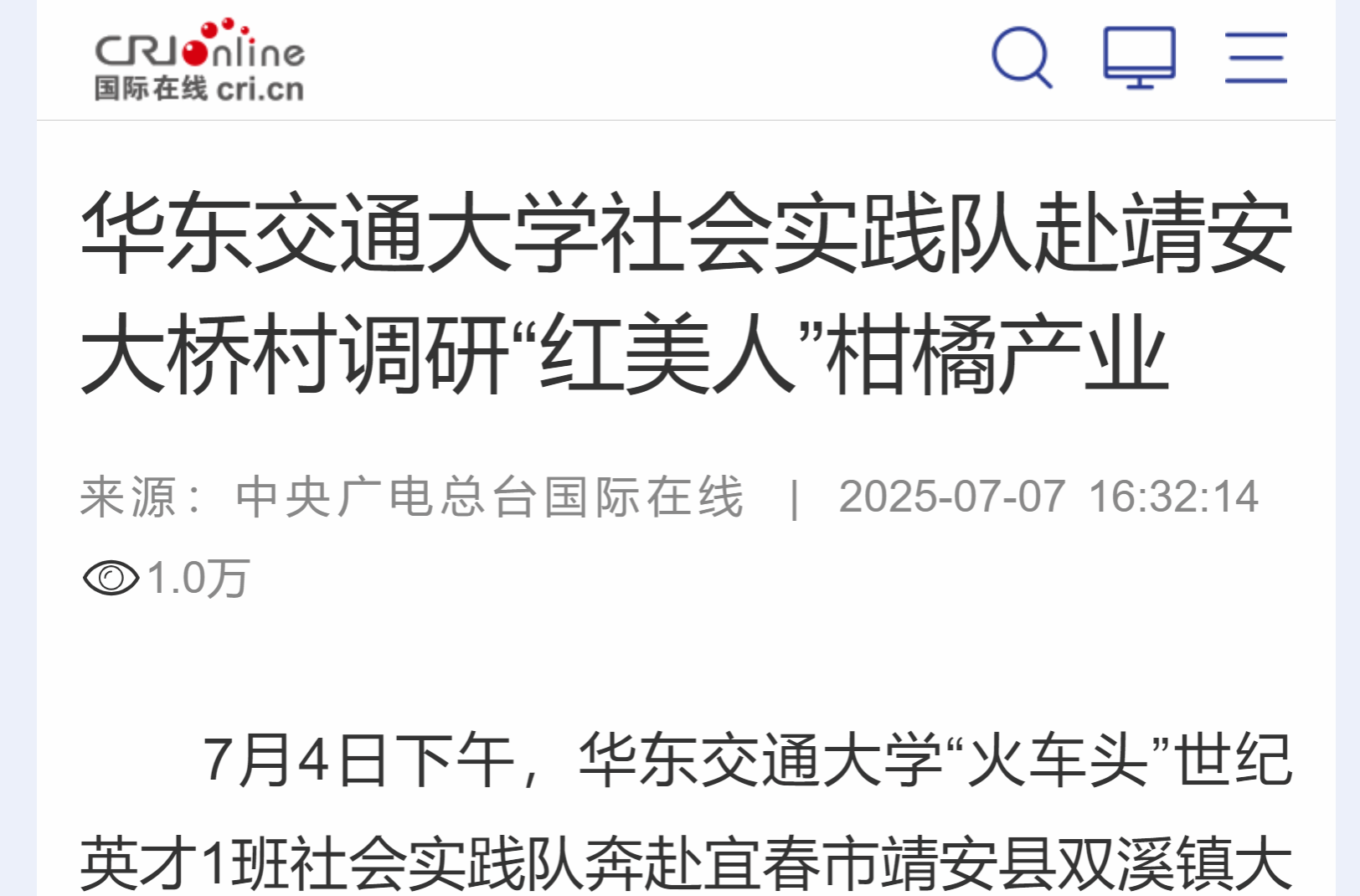 7月4日下午,华东交通大学“火车头”世纪英才1班社会实践队奔赴宜春市靖安县双溪镇大桥村,对当地集体经济项目“红美人”柑橘种植基地展开深度调研。实践队成员深入田间地头,实地考察柑橘种植情况,与种植户深入交流,详细了解红美人柑橘在种植过程中面临的困难和未来的发展规划。
